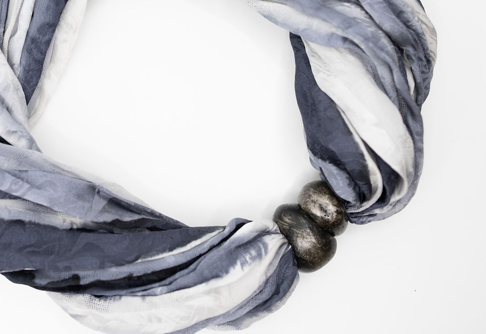 Le colliers foulard en soie jacqurd de haute qualité est peints à la main. Il a un fermoir magnétique et peut être portés comme bandeau, foulard ou - complété par des perles décoratives -comme collier. Les instructions de lavage sont jointes